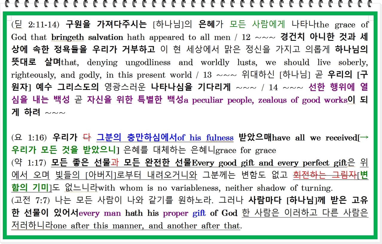 (고전 12:9) 다른 사람에게는 같은 성령을 통하여 믿음을To another faith by the same Spirit, 다른 사람에게는 같은 성령을 통하여 병 고치는 선물들을to another the gifts of healing by the same Spirit,