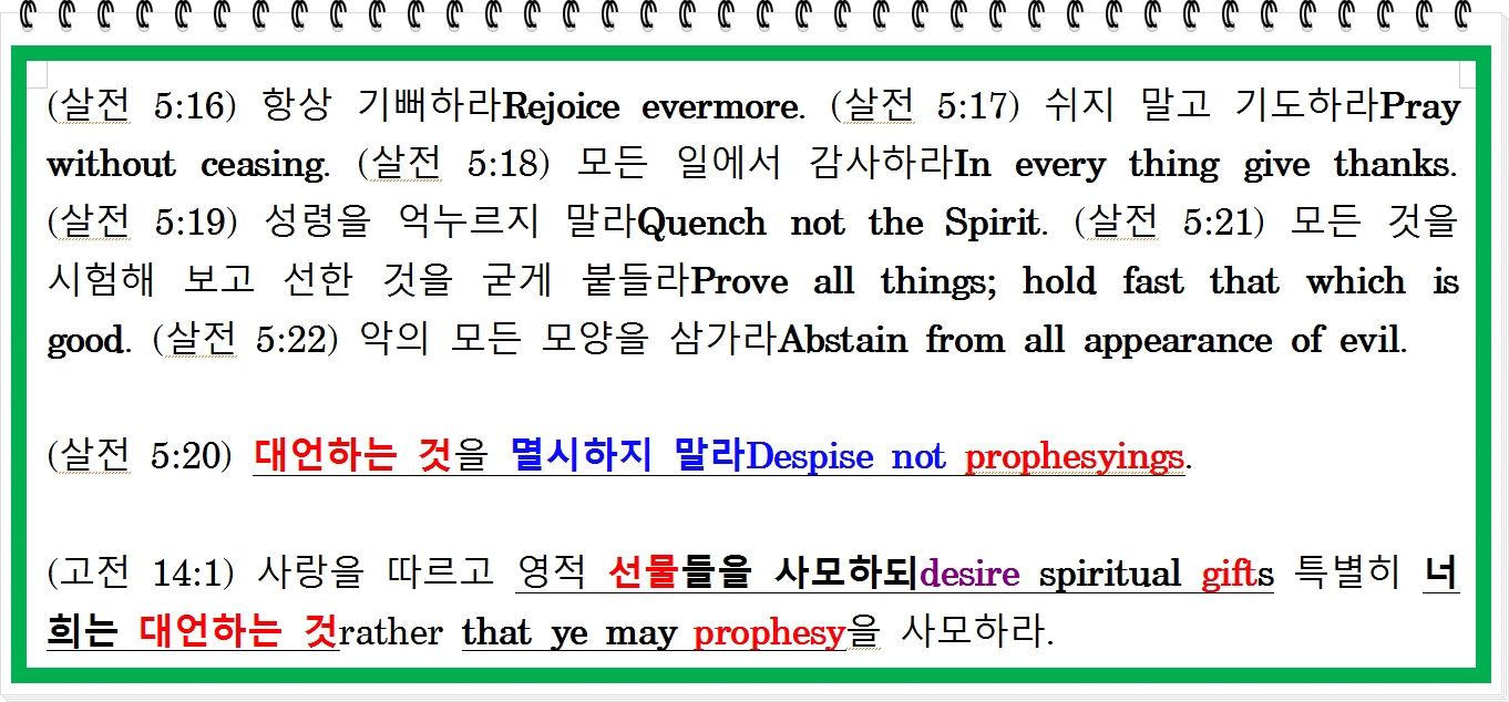 (벧후 1:19-21) 또한 우리에게는 더 확실한 대언의 말씀word of prophecy이 있으니 날이 새어 샛별이 너희 마음속에 떠오를 때까지until the day dawn, and the day star arise in your hearts 너희가 어두운 곳에서 비치는 빛을 대하듯 이 말씀에 주의를 기울이는 것이 잘하는 것이니라whereunto ye do well that ye take heed. / 20 먼저 이것을 알라. 성경 기록의 대언은 결코 어떤 사적인 해석에서 나지 아니하였나니no prophecy of the scripture is of any private interpretation / 21 대언은 옛적에 사람의 뜻으로 말미암아 나오지 아니하였고 오직 [하나님]의 거룩한 사람들은 [성령님]께서 자기들을 움직이시는 대로 말하였느니라.For the prophecy came ~~~ as they were moved by the Holy Ghost
