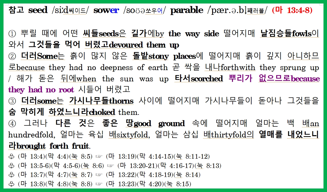 (막 4:5-6) 더러는 흙이 많지 않은 돌밭stony ground에 떨어지매 흙이 깊지 아니하므로because it had no depth of earth 즉시 싹을 내나sprang up / 6 해가 돋은 뒤에 타서scorched 뿌리가 없으므로because it had no root 시들어 버렸고withered away
