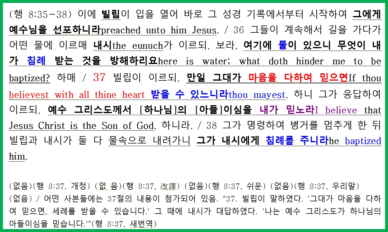 (행 19:3-5) 그가 그들에게 이르되, 그러면 너희가 무슨 침례를 받았느냐? 하니 그들이 이르되, 요한의 침례John's baptism라, 하매 / 4 이에 바울이 이르되, 참으로 요한이 회개의 침례로 침례를 주며 백성에게 말하여 그들이 자기 뒤에 오실 분 곧 그리스도 예수님을 믿어야 한다고 하였느니라John baptized with the baptism of repentance, saying unto the people, that they should believe on him which should come after him, that is, on Christ Jesus, 하거늘 / 5 그들이 이 말을 듣고heard this [주] 예수님의 이름으로 침례를 받으니라were baptized in the name of the Lord Jesus.
