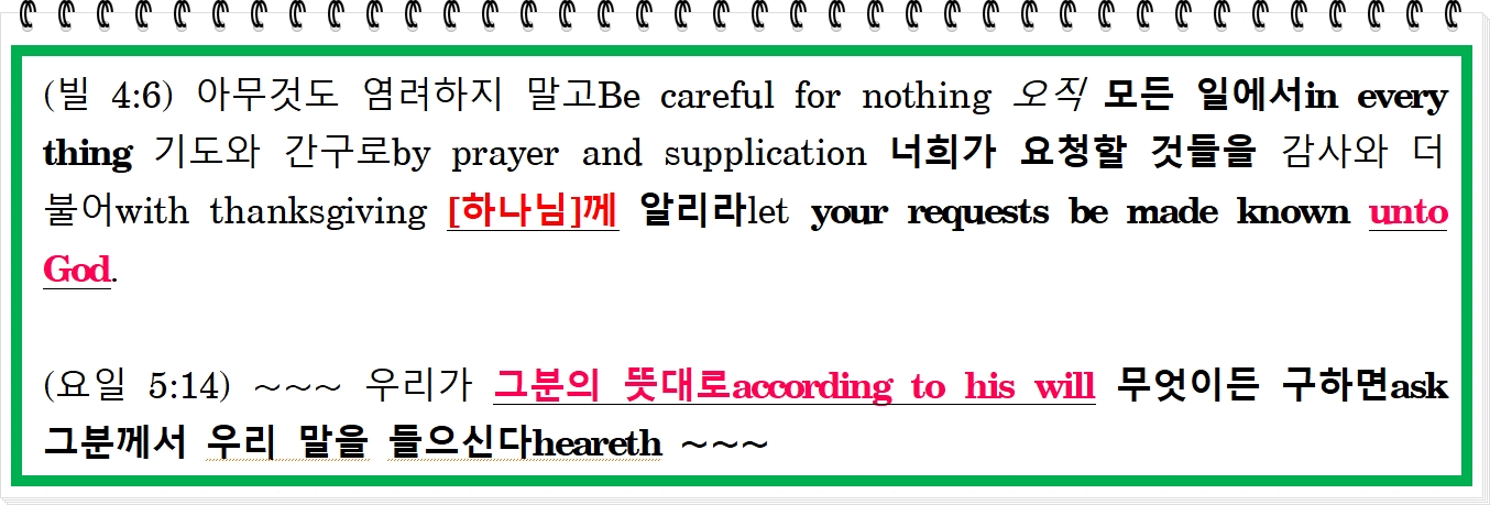 (요 15:7) 너희가 내 안에 거하고If ye abide in me 내 말들이 너희 안에 거하면, and my words abide in you 너희가 원하는 바를 구하라ye shall ask what ye will. 그러면, and 그것이 너희에게 이루어지리라it shall be done unto you.