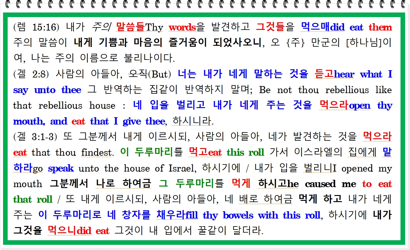 (요 6:63) 살리는 것은 영이며It is the spirit that quickeneth 육은 아무것도 유익하게 하지 못하느니라the flesh profiteth nothing. 내가 너희에게 이르는 말(씀)들은 곧 영이요 생명이니라the words that I speak unto you, they are spirit, and they are life.