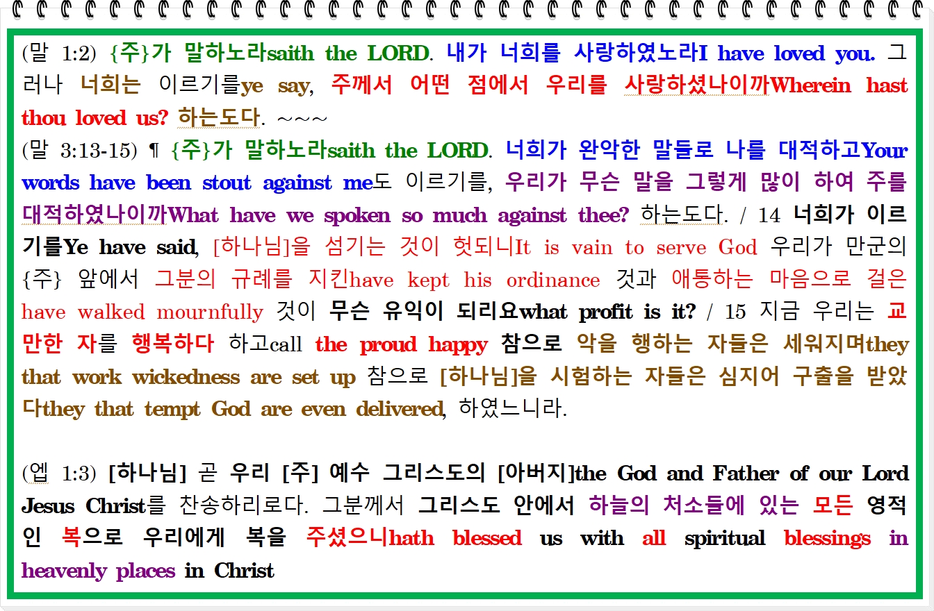 (잠 3:11-12) ¶ 내 아들아, {주}의 징계를 멸시하지 말며despise not the chastening of the LORD 그분께서 바로잡아 주시는 것에 싫증을 내지 말라neither be weary of his correction. / 12 아버지가 자기가 기뻐하는 아들을 바로잡아 주는 것 같이 {주}께서 자신이 사랑하는 자를 바로잡아 주시느니라whom the LORD loveth he correcteth.