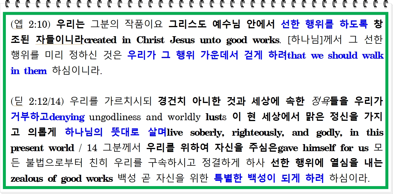 (고후 5:17) 그런즉 누구든지 그리스도 안에 있으면if any man be in Christ 그는 새로운 창조물a new creature이라. 옛 것들은 지나갔으니old things are passed away, 보라, 모든 것이 새롭게 되었도다.