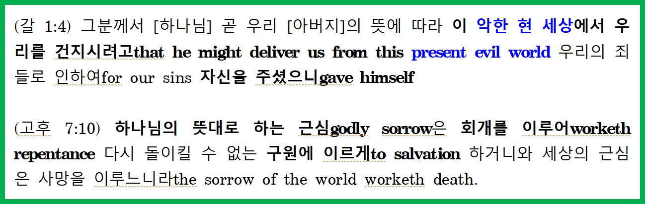 (요일 2:15) 세상이나 세상에 있는 것들을 사랑하지 말라Love not the world, neither the things that are in the world. 어떤 사람이 세상을 사랑하면If any man love the world [아버지]의 사랑이 그 속에 있지 아니하니the love of the Father is not in him