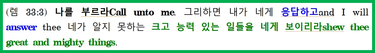 (시 118:5) 내가 고통 중에 {주}를 부르니called upon the LORD {주}께서 내게 응답하시고answered 나를 넓은 곳에 세우셨도다.