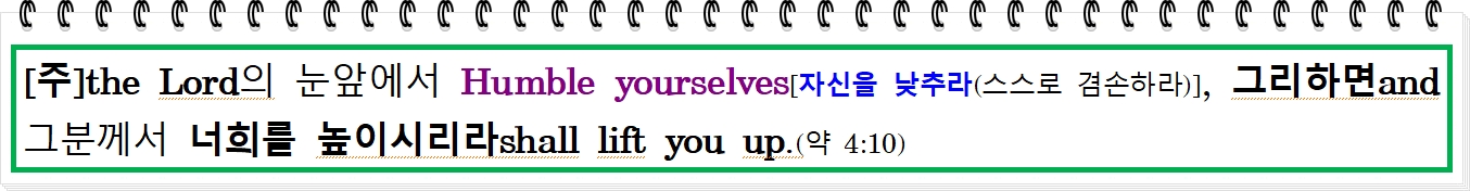 (벧전 5:5-6) ~~~ [하나님]God께서 교만한 자는 물리치시고resisteth the proud the humble(자기를 낮추는 자들/겸손한 자)에게는 은혜를 주시느니라giveth grace. / 6 그러므로 [하나님]의 강한 손 밑에서under the mighty hand of God Humble yourselves[자신을 낮추라(스스로 겸손하라)]. 그리하면 정하신 때에 그분께서 너희를 높이시리라that he may exalt you in due time.