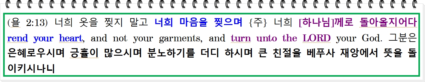 (레 23:26-32) ¶ {주}the LORD께서 모세Moses에게 말씀하여 이르시되, / 27 또한 이 일곱째 달의 십일the tenth day of this seventh month은 속죄일a day of atonement이니 그것은 너희에게 거룩한 집회 날이 되리라. 너희는 너희 혼을 괴롭게 하며shall afflict your souls 불로 예비하는 헌물을 {주}께 드리고offer / 28 그 날에는 아무 일도 하지 말지니shall do no work 그 날은 너희를 위해 {주} 너희 [하나님] 앞에서 속죄하는 속죄일이니라. / 29 어떤 혼soul이든지 그 날에 괴로움을 당하지 아니하면not be afflicted 그는 자기 백성 가운데서 끊어지리라cut off. / 30 또 어떤 혼이든지 그 날에 어떤 일을 행하면 바로 그 혼은 내가 그의 백성 가운데서 멸절시키리니destroy / 31 너희는 어떤 일도 하지 말라. 그것은 너희 모든 처소에서 너희 대대로 영원한 법규a statute for ever가 될지니라. / 32 그 날은 너희에게 안식하는 안식일a sabbath이니 너희는 너희 혼을 괴롭게 하고shall afflict your souls 그 달 구일 저녁 곧 그 저녁부터 다음 날 저녁까지 너희의 안식일을 기념할지니라.