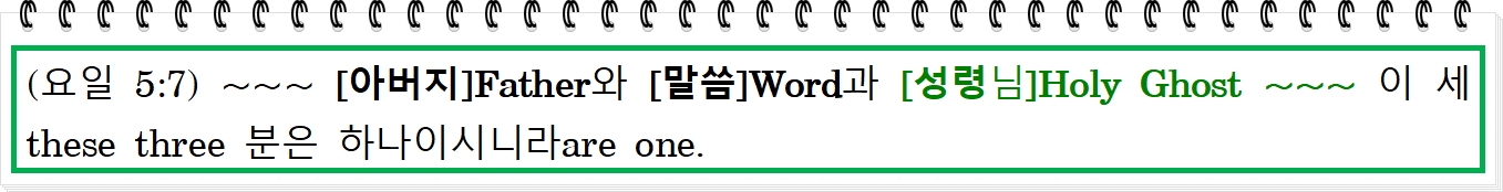 (요일 5:7) 하늘에 증언하는 세three 분이 계시니 곧 [아버지]Father와 [말씀]Word과 [성령님]Holy Ghost이시라. 또 이 세these three 분은 하나이시니라are one.