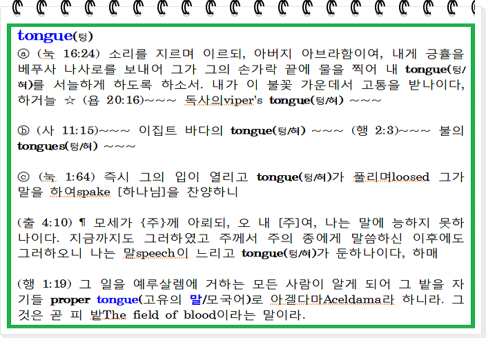 (행 2:4/8) 그들이 다 [성령님]으로 충만하여 성령께서 그들에게 말하게 하시는 대로 other tongues(다른 언어들)로 말하기 시작하더라. / 8 그런데 어떻게 우리 각 사람이 우리가 태어난 곳의 우리 언어our own tongue로 듣느냐?
