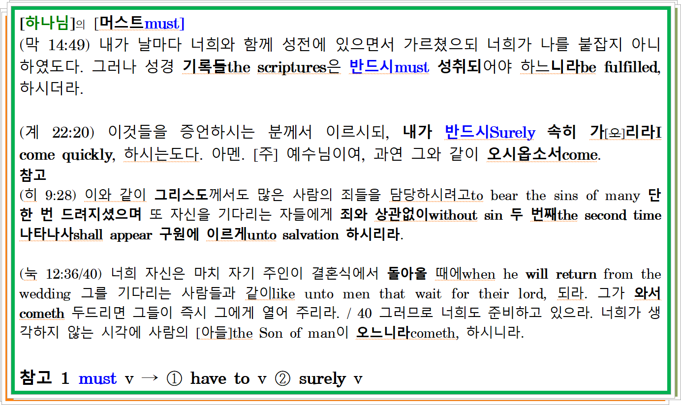 (눅 24:44) 또 그분께서 그들에게 이르시되, 내가 여전히 너희와 함께 있었을 때에 너희에게 말한 말들 곧 모세의 율법과 대언자들의 글과 시편에 나에 관하여 기록된 모든 것이 반드시must 성취되어야 하리라 한 말들이 이것들이라, 하시고
