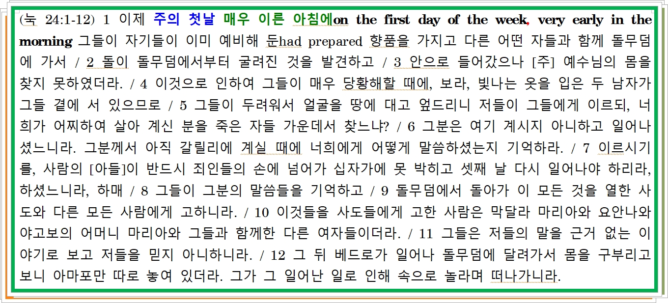 (눅 23:54-56) 그 날은 예비일이며that day was the preparation 안식일이 다가오더라the sabbath drew on. / 55 갈릴리에서부터 그분과 함께 온 여자들the women도 뒤를 따라가서 그 돌무덤을 보고beheld the sepulchre 또 그분의 몸을 어떻게 두었는지how his body was laid 보고 / 56 돌아가서returned 향품과 기름을 예비한prepared spices and ointments 뒤 명령에 따라 안식일에 안식하더라rested the sabbath day.