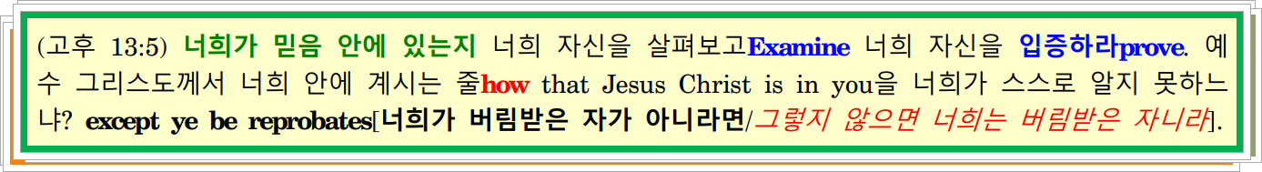 (갈 6:4) 오직 각 사람은 자기 일을 입증할지니라let every man prove his own work. 그리하면 그는 다른 사람이 아니라 자기 안에서만 기쁨을 누리리니