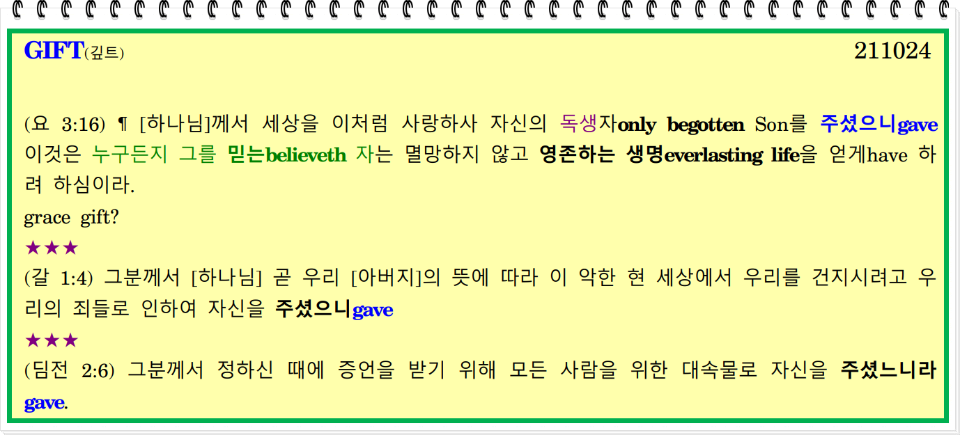 (벧전 4:10) 각 사람이 gift선물을 받은 대로 [하나님]의 여러 가지 은혜를 맡은 선한 청지기로서 서로 그 선물을 써서 섬기라.