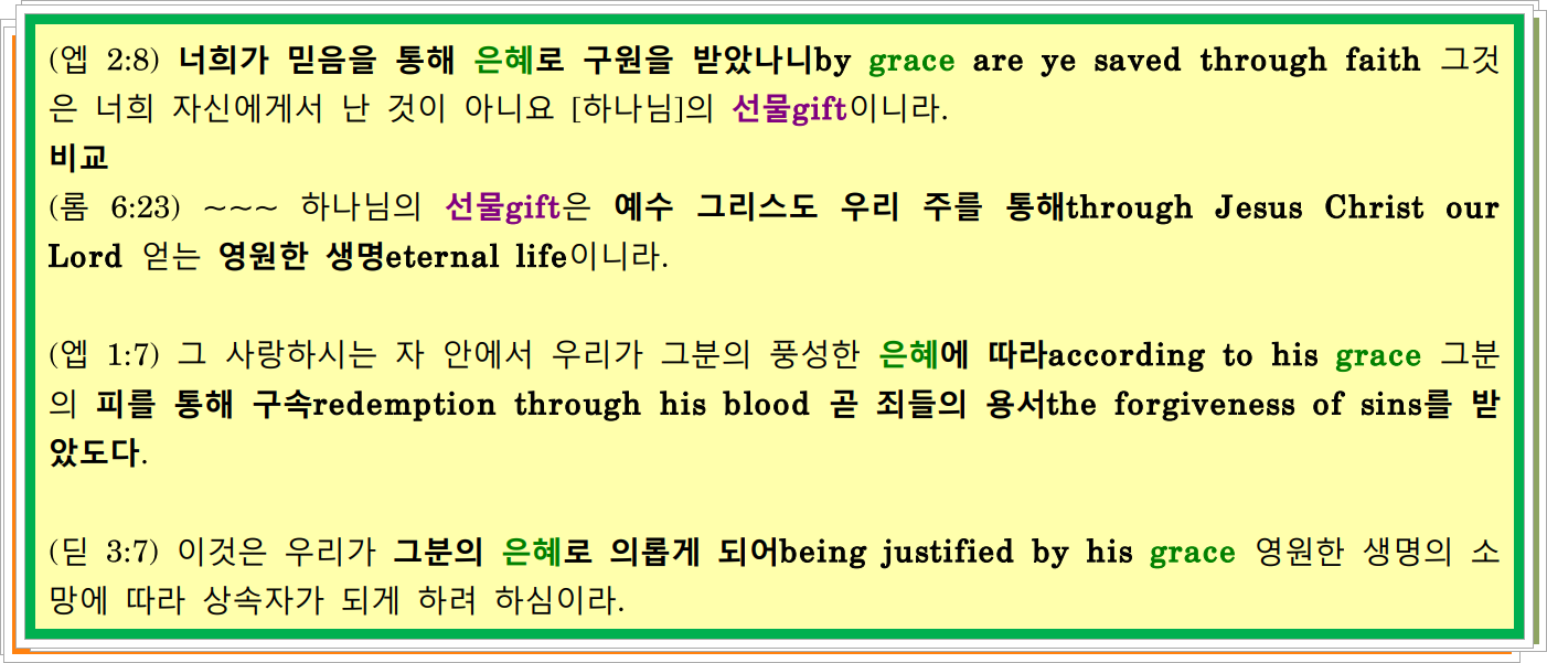 (딛 3:4-7) 사람을 향한 [하나님] 곧 우리의 [구원자]의 친절kindness과 사랑love이 나타난 뒤에 / 5 그분께서 우리를 구원하시되he saved us 우리가 행한 의로운 행위로 하지 아니하시고 ~~~ / 6 예수 그리스도 곧 우리의 [구원자]를 통하여 우리에게 성령님을 풍성히 부어 주셨으니 / 7 이것은 우리가 그분의 은혜grace로 의롭게 되어 영원한 생명의 소망에 따라 상속자가 되게 하려 하심이라.
