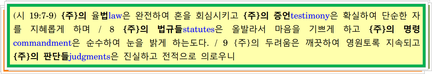 (시 119:1-2) {주}의 법the law of the LORD 안에서 걸으며walk 그 길에서 더럽혀지지 아니한 자들은 복이 있도다Blessed. / 2 그분의 증언들testimonies을 지키고keep 온 마음으로 그분을 찾는 자들은 복이 있나니