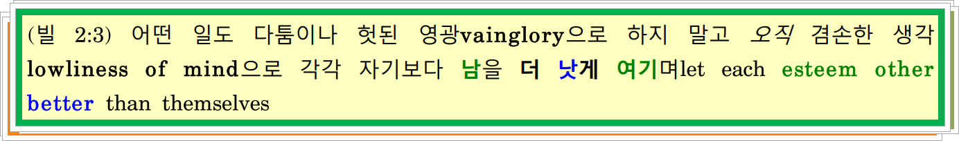 (빌 2:3/5) ~~~ 자기보다 남을 더 낫게 여기며esteem other better / 5 너희 안에 이 생각mind을 품을지니 그것은 그리스도 예수님 안에in Christ Jesus도 있던 생각이라.