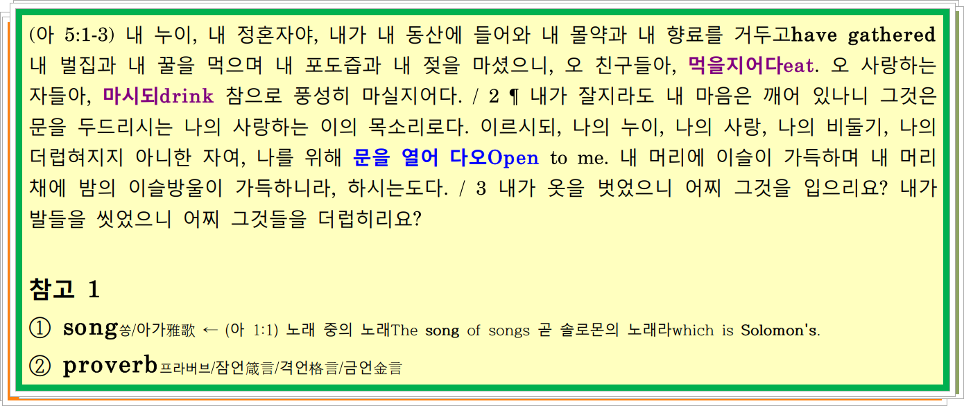 (계 3:20) 보라, 내가 문에 서서 두드리노니knock 누구든지 내 음성을 듣고hear 문을 열면open the door 내가 그에게로 들어가come in 그와 함께 만찬을 먹고 그는 나와 함께 먹으리라.