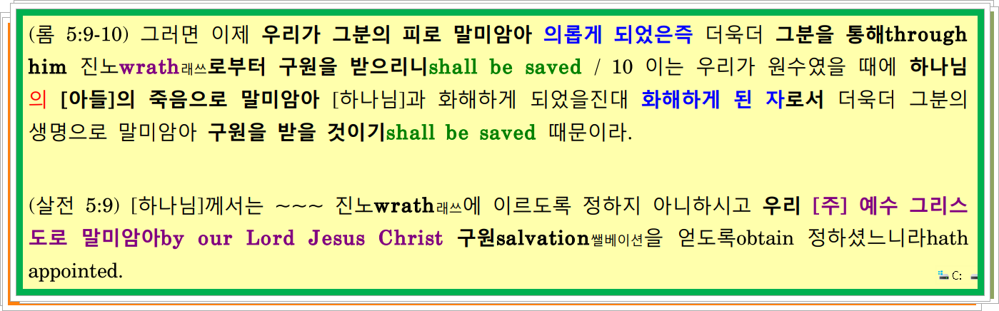 (살전 1:10) 그분께서 죽은 자들로부터 살리신 그분의 [아들]께서 하늘로부터 오실 것을 기다리는지 보여 주나니 이분은 곧 다가올 진노the wrath래쓰 to come로부터 우리를 건져 내신deliver딜리버ed 예수님Jesus이시니라.