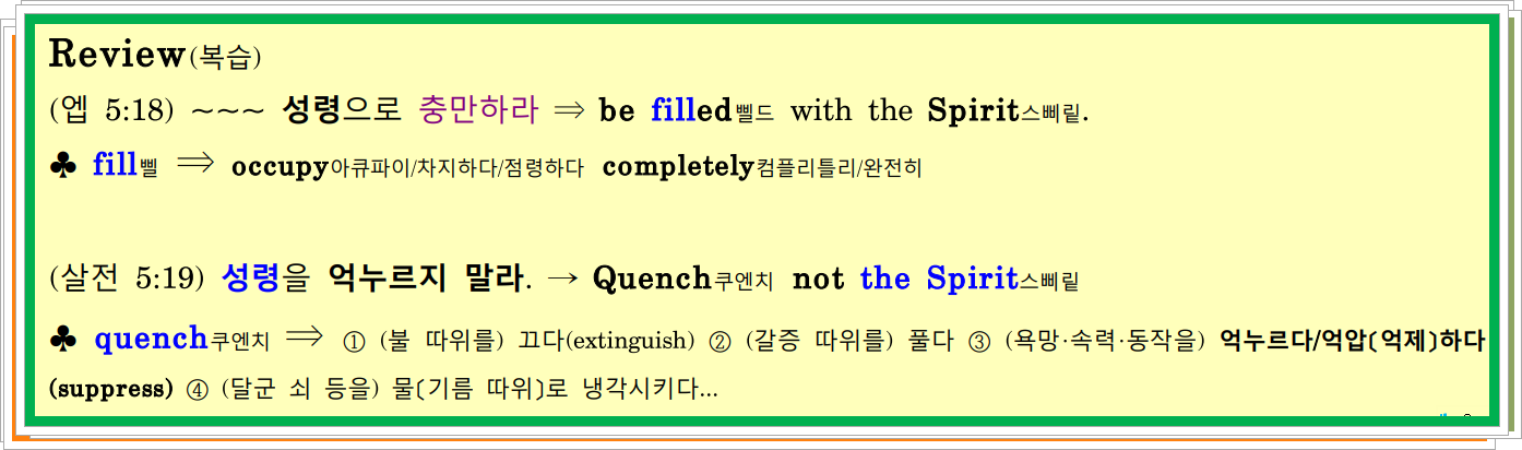 ⑤ Quench쿠엔치 not the Spirit스삐맅 (KJV) → 성령을 억누르지 말라.
