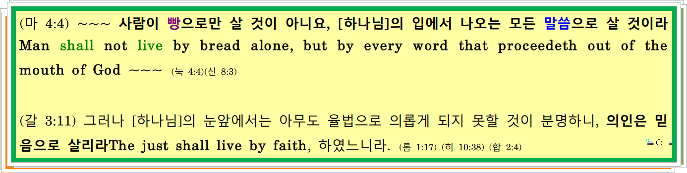(시 19:8-10) {주}의 법규들은 올발라서 마음을 기쁘게 하고 {주}의 명령은 순수하여 눈을 밝게 하는도다. / 9 {주}의 두려움은 깨끗하여 영원토록 지속되고 {주}의 판단들은 진실하고 전적으로 의로우니 / 10 그것들은 금보다, 참으로 많은 정금보다 더 사모해야 할 것들이며 또 꿀과 벌집보다 더 달도다.