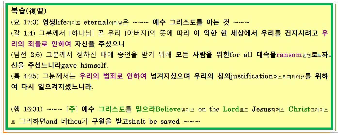 (살전 4:16-18) [주]the Lord께서 호령과 천사장의 음성과 [하나님]의 나팔 소리와 함께 친히 하늘로부터 내려오시리니shall descend디센드 그리스도 안에서 죽은 자들이 먼저 일어나고 / 17 그 뒤에 살아서 남아 있는 우리가 그들과 함께 구름들 속으로 채여 올라가shall be caught up 공중에서 [주]를 만나리라to meet the Lord in the air. 그리하여 우리가 항상 [주]와 함께 있으리라. / 18 그러므로 이 말씀들로 서로 위로하라comfort컴포트 one another with these words.