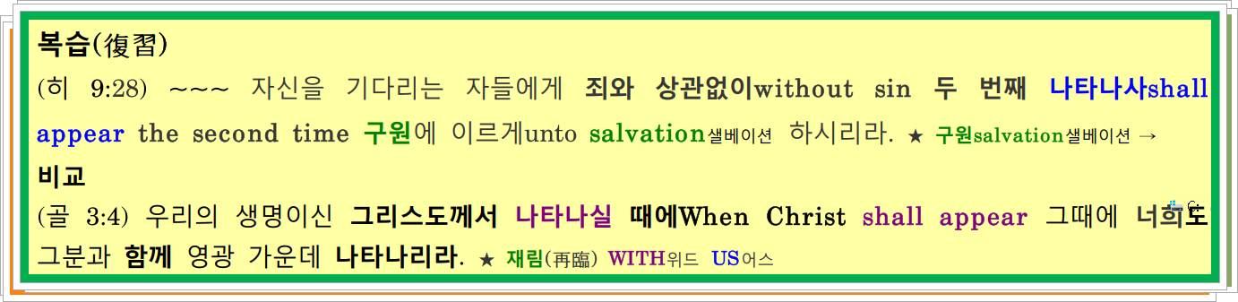 (살전 4:16-18) [주]the Lord께서 호령과 천사장의 음성과 [하나님]의 나팔 소리와 함께 친히 하늘로부터 내려오시리니shall descend디센드 그리스도 안에서 죽은 자들이 먼저 일어나고 / 17 그 뒤에 살아서 남아 있는 우리가 그들과 함께 구름들 속으로 채여 올라가caught코트 up엎 공중에서in the air [주]를 만나리라meet the Lord. 그리하여 우리가 항상 [주]와 함께 있으리라. / 18 그러므로 이 말씀들로 서로 위로하라comfort컴포트 one another with these words.