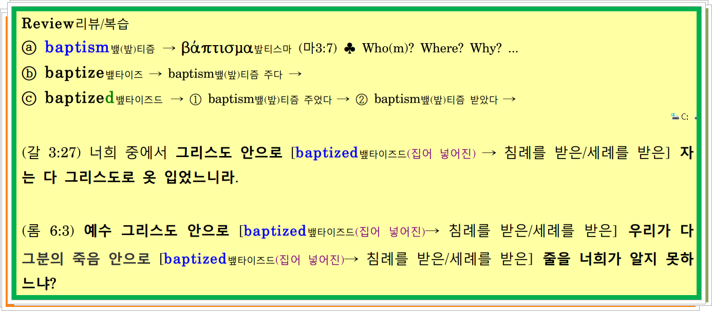 (행 19:1-5) 아볼로Apollos가 고린도Corinth에 있는 동안 바울이 위 지방들을 두루 다니고 에베소Ephesus에 이르러 어떤 제자disciple디싸이펄들s을 만나 / 2 그들에게 이르되, 너희가 믿은 이래로 [성령님]을 받은 적이 있느냐Have received the Holy Ghost? 하니 그들이 그에게 이르되, 우리는 [성령님]이 계신다는 말도 들은 적이 없노라, 하거늘 / 3 그가 그들에게 이르되, 그러면 너희가 무슨 침례를 받았느냐baptized? 하니 그들이 이르되, 요한의 침례John's baptism뱊(밮)티즘라, 하매 / 4 이에 바울이 이르되, 참으로 요한이 회개의 침례로 침례를 주며 백성에게 말하여 그들이 자기 뒤에 오실 분 곧 그리스도 예수님을 믿어야 한다고 하였느니라, 하거늘 / 5 그들이 이 말을 듣고 [주] 예수님의 이름으로 [were baptized뱊타이즈드 → 침례를 받으니라].