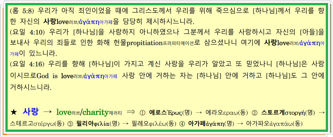 (요일 4:7-8) 사랑하는 자들아, 우리가 서로 사랑하자love/ἀγαπάω아가파오 사랑love러브/ἀγάπη아가페은 [하나님]께 속한 것인즉 사랑하는love/ἀγαπάω아가파오 자마다 [하나님]에게서 나서 [하나님]을 알고 / 8 사랑하지love/ἀγαπάω아가파오 아니하는 자는 [하나님]을 알지 못하나니 이는 [하나님]이 사랑love러브/ἀγάπη아가페이시기 때문이라