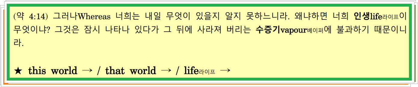 (벧전 1:23-25) 다시 태어나는 것Being born again은 썩는 씨에서가 아니라 썩지 않는 것에서 곧 살아 있고 영원히 거하는 하나님의 말씀에 의해서by the word of God이니라. / 24 이는For 모든 육체flesh는 풀grass과 같고 사람man의 모든 영광은 풀의 꽃과 같기 때문이니라. 풀은 시들고withereth 그것의thereof 꽃은 떨어지니라falleth away. / 25 그러나But 주의 말씀the word of the Lord은 영원토록 지속되느니라. 그리고 이것이 복음을 통해by the gospel 너희에게 선포된 그 말씀the word이니라.