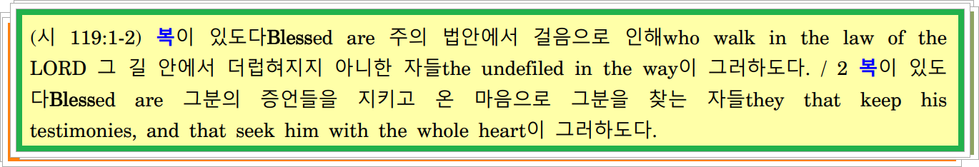 (시 128:1) 복이 있도다Blessed is 주를 두려워하고that feareth the LORD 그분의 길들 안에서 걷는that walketh in his ways 자는 다every one 그러하도다.