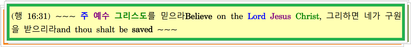 (16:31) ~~~ 주 예수 그리스도를 믿으라Believe on the Lord Jesus Christ, 그리하면 네가 구원을 받으리라and thou shalt be saved ~~~