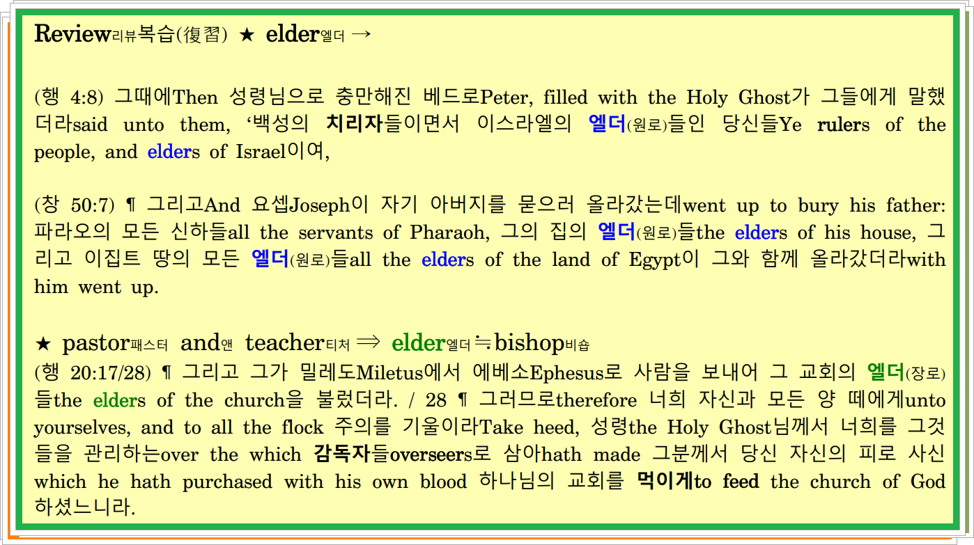 (히 11:1-2) 이제Now 믿음faith은 소망하는 것들의 본체the substance of things hoped for요, 보이지 않는 것들의 증거the evidence of things not seen니라. / 2 이는For 그것을 통해by it 엘더(조상)들the elders이 좋은 평판을 얻었기obtained a good report 때문이라.