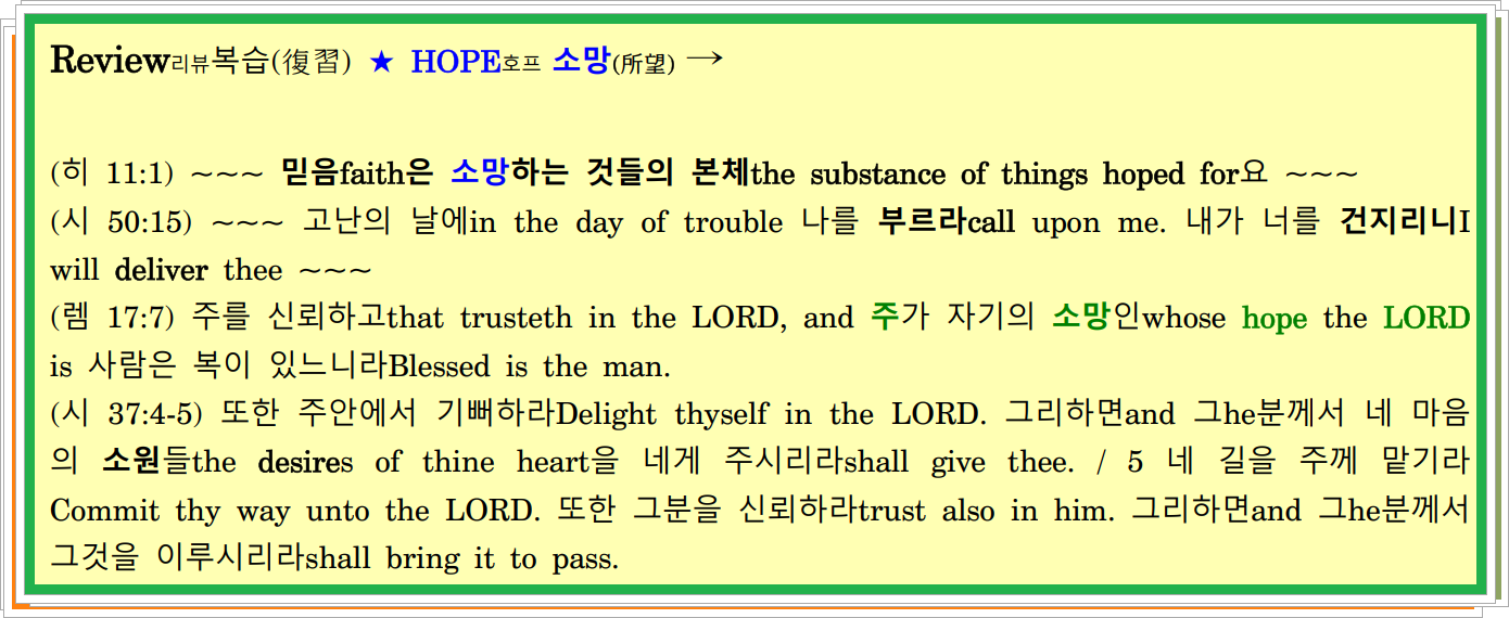 (엡 1:3/7/13-14) 하나님 곧 우리 주 예수 그리스도의 아버지를 찬송하리로다. ~~~ / 7 그 사랑하시는 자 안에서 우리가 그분의 풍성한 은혜에 따라 그분의 피를 통해 구속redemption 곧 죄들의 용서the forgiveness of sins를 받았도다. / 13 너희도 진리의 말씀the word of truth 곧 너희의 구원의 복음the gospel of your salvation을 들은 뒤에 그분을 신뢰하였고 너희가 믿은 뒤에 또한 그분 안에서 약속의 저 거룩하신 영that holy Spirit of promise으로 봉인되었느니라. / 14 이 영께서는 값 주고 사신 그 소유물이 구속을 받을 때까지until the redemption of the purchased possession 우리의 상속의 보증이 되사 그분의 영광을 찬양하게 하시느니라.