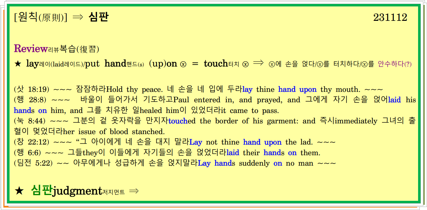 (히 6:1-2) 그러므로Therefore 그리스도의 교리의 기초 원리들을 떠나leaving the principles of the doctrine of Christ 우리가 완전함으로 나아가자let us go on unto perfection. 그 기초를 다시 세우지말자not laying again the foundation. 그것은 죽은 행위들로부터의 회개에 관한of repentance from dead works 그리고and 하나님을 향한 믿음에 관한of faith toward God / 2 침례들의 교리에 관한Of the doctrine of baptisms 그리고and 손을 얹는 것에 관한of laying on of hands 그리고and 죽은자들의 부활에 관한of resurrection of the dead 그리고and 영원한 심판에 관한of eternal judgment 것이라.