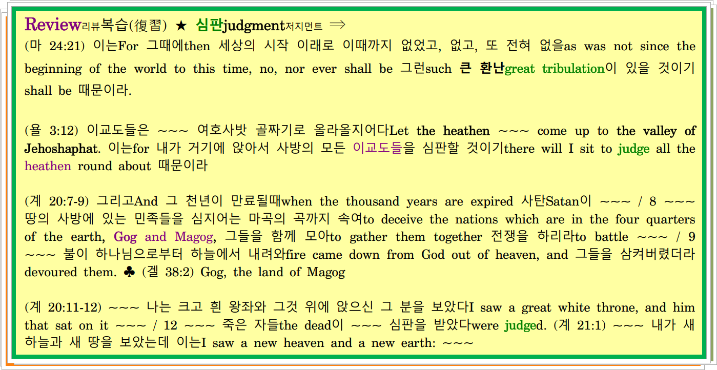 (딤후 4:1-2) 그러므로therefore 내I가 하나님God 곧and 그분께서 나타나셔서 그분의 왕국에서at his appearing and his kingdom 산 자들과 죽은 자들을 심판하실 주 예수 그리스도the Lord Jesus Christ, who shall judge the quick and the dead앞에서before 네게 명하노라charge thee. / 2 말씀을 선포하라Preach the word. 때를 가리지말고 긴급히 하라be instant in season, out of season. 모든 오래 참음과 교리로with all longsuffering and doctrine 책망하고 꾸짖고 권면하라reprove, rebuke, exhort.
