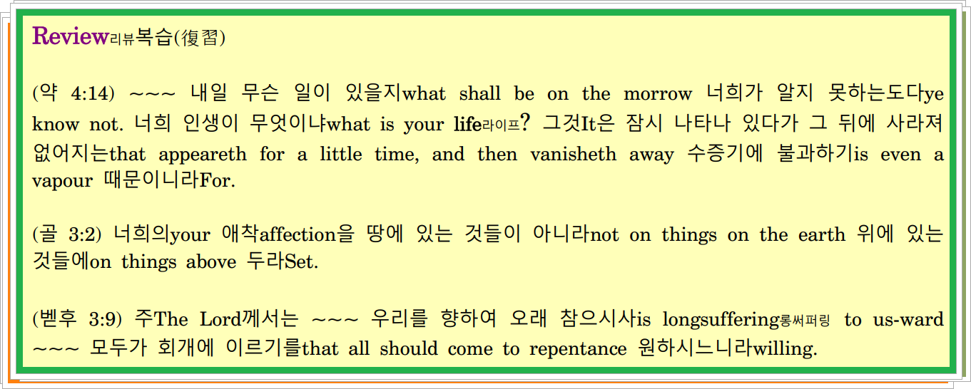 (벧전 2:11) 지극히 사랑하는 자들Dearly beloved아 내가I 나그네들과 순례자들인 너희에게you as strangers and pilgrims 간청하노니beseech비시치 혼을 대적하여 싸우는which war against the soul 육체의 욕망들을 삼가라abstain from fleshly lusts.