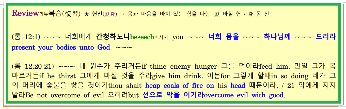 (롬 10:17) So then faith cometh by hearing, and hearing by the word of God. ~~~믿음faith페이쓰은 들음에 의해by hearing 그리고and 들음hearing은 하나님의 말씀에 의해by the word of God 오느니라cometh.