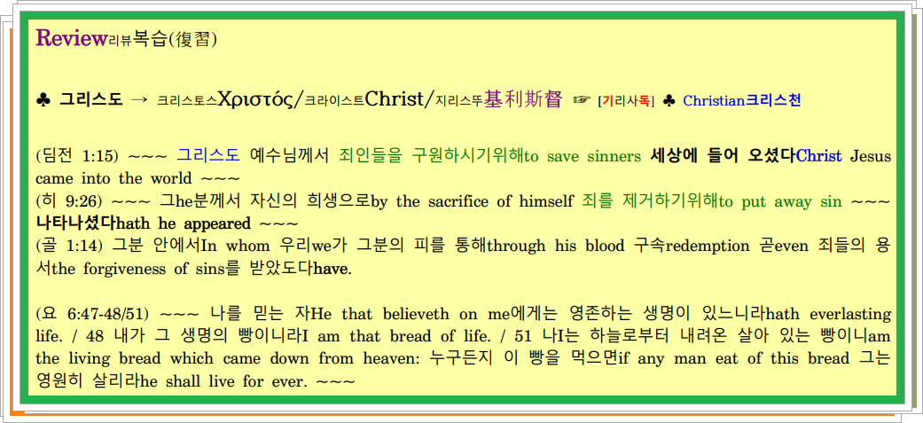 (계 1:5-6) ~~~ 예수 그리스도Jesus Christ ~~~ 우리를 사랑해서 자기 자신의 피로 우리의 죄들에서 우리를 씻겨주신 그분께Unto him that loved us, and washed us from our sins in his own blood / 6 그리고 하나님 곧 자신의 아버지께, 우리를 왕들과 제사장들로 만들어 주신 그분께And hath made us kings and priests unto God and his Father; to him 영광과 통치가 영원무궁토록 있기를be glory and dominion for ever and ever. 아멘Amen.