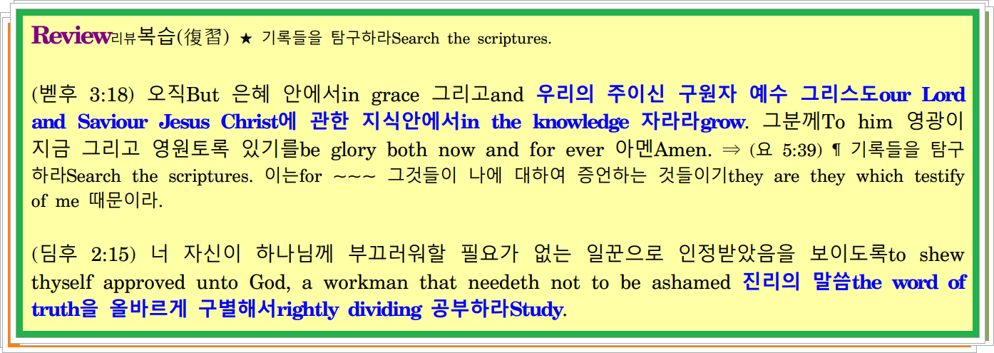 (벧전 3:15) 오직But 너희 마음속에서in your hearts 주 하나님을 성별하라sanctify the Lord God 그리고and 너희 속에 있는 소망의 이유를 너희에게 묻는 각 사람 모두에게to every man that asketh you a reason of the hope that is in you 온유함과 두려움으로with meekness and fear 항상 답을 줄 수 있도록always to give an answer 준비하라be ready.
