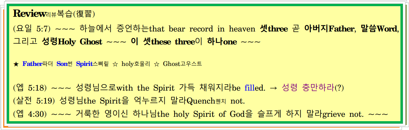 (요 14:26) 그러나But 그 위로자the Comforter 곧 아버지께서 내 이름으로 보내실 성령님the Holy Ghost, whom the Father will send in my name이신 그he분께서 너희에게 모든 것을 가르치시고teach you all things, and 내가 너희에게 말한 것은 무엇이든지 다whatsoever I have said unto you 곧 모든 것들all things을 너희에게 기억나게 해주시리라shall bring all things to your remembrance.