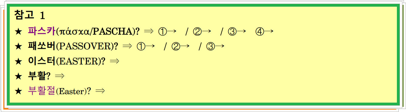(고전 5:7) 그러므로therefore 너희는 누룩 없는 자들인즉as ye are unleavened 너희가 새 덩어리가 되도록that ye may be a new lump 묵은 누룩을 제거하라Purge out the old leaven. 이는For 우리의 패쏘버 곧 그리스도even Christ our passover께서 우리를 위하여 희생되셨기is sacrificed for us 때문이라. ♣ 파스카πάσχα