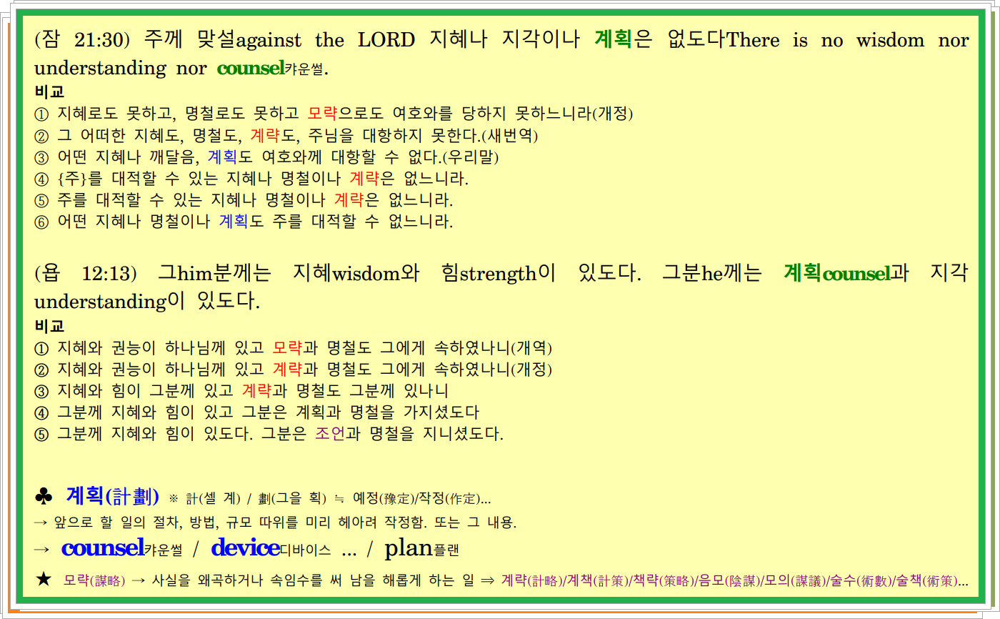 (사 28:29) 이것This 또한also 계획에서 놀라우시고 일함에서 뛰어나신which is wonderful in counsel, and excellent in working 만군의 주님으로부터from the LORD of hosts 나오는도다cometh forth.