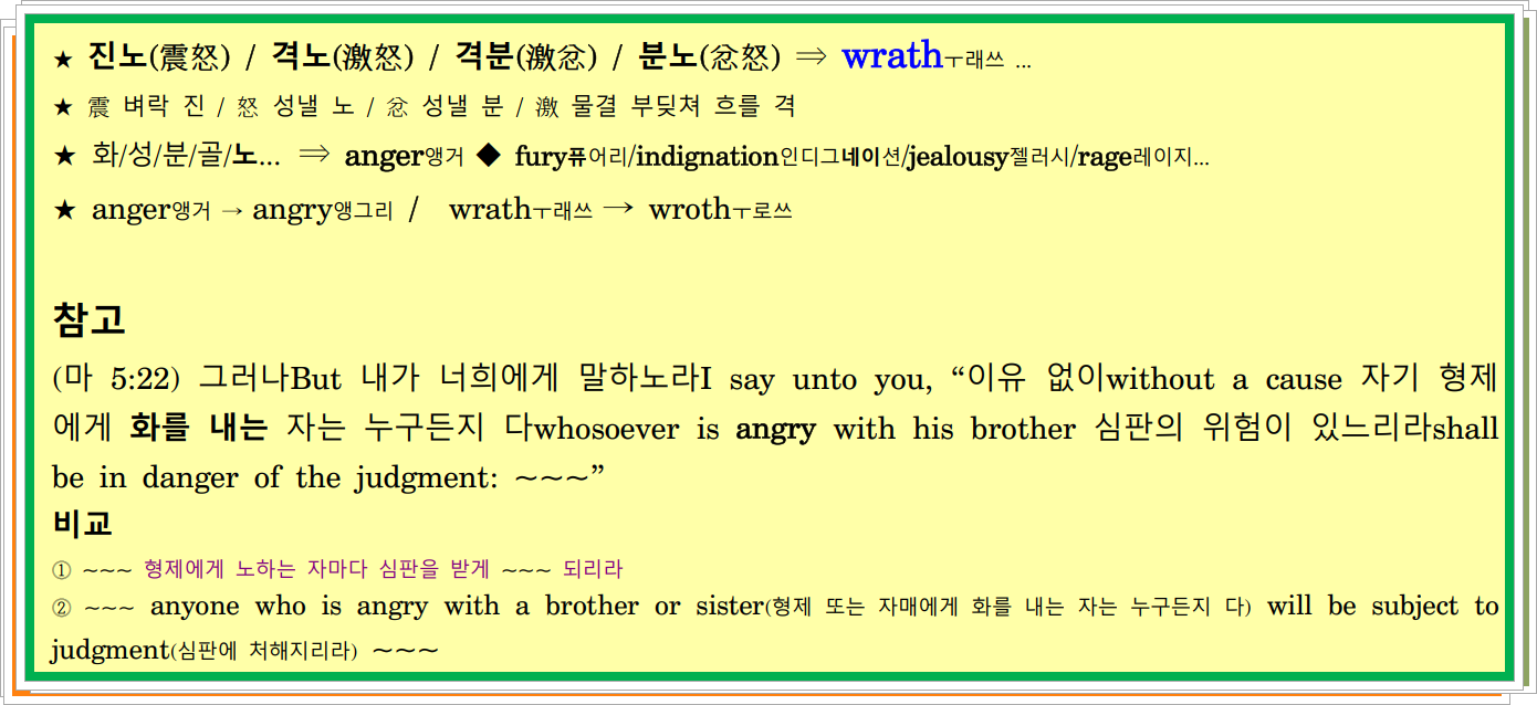 (창 4:5) 그러나But 그he분께서는 가인에게 그리고 그의 헌물에unto Cain and to his offering 관심을 갖지 아니하셨더라had not respect. 그래서And 가인Cain이 몹시 분을 냈더라was very wroth 그리고and 그의 얼굴빛이 나빠졌더라his countenance fell. ★ anger앵거 → angry앵그리 / wrathㅜ래쓰 → wrothㅜ로쓰
