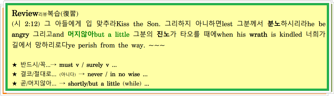 (눅 24:44) ~~~ 모세의 법에in the law of Moses 그리고and 대언자서들에in the prophets 그리고and 시편에in the psalms 나에 관하여concerning me 기록된 모든 것들all things ~~~, which were written은 반드시must 성취되어야be fulfilled 하리라 ~~~