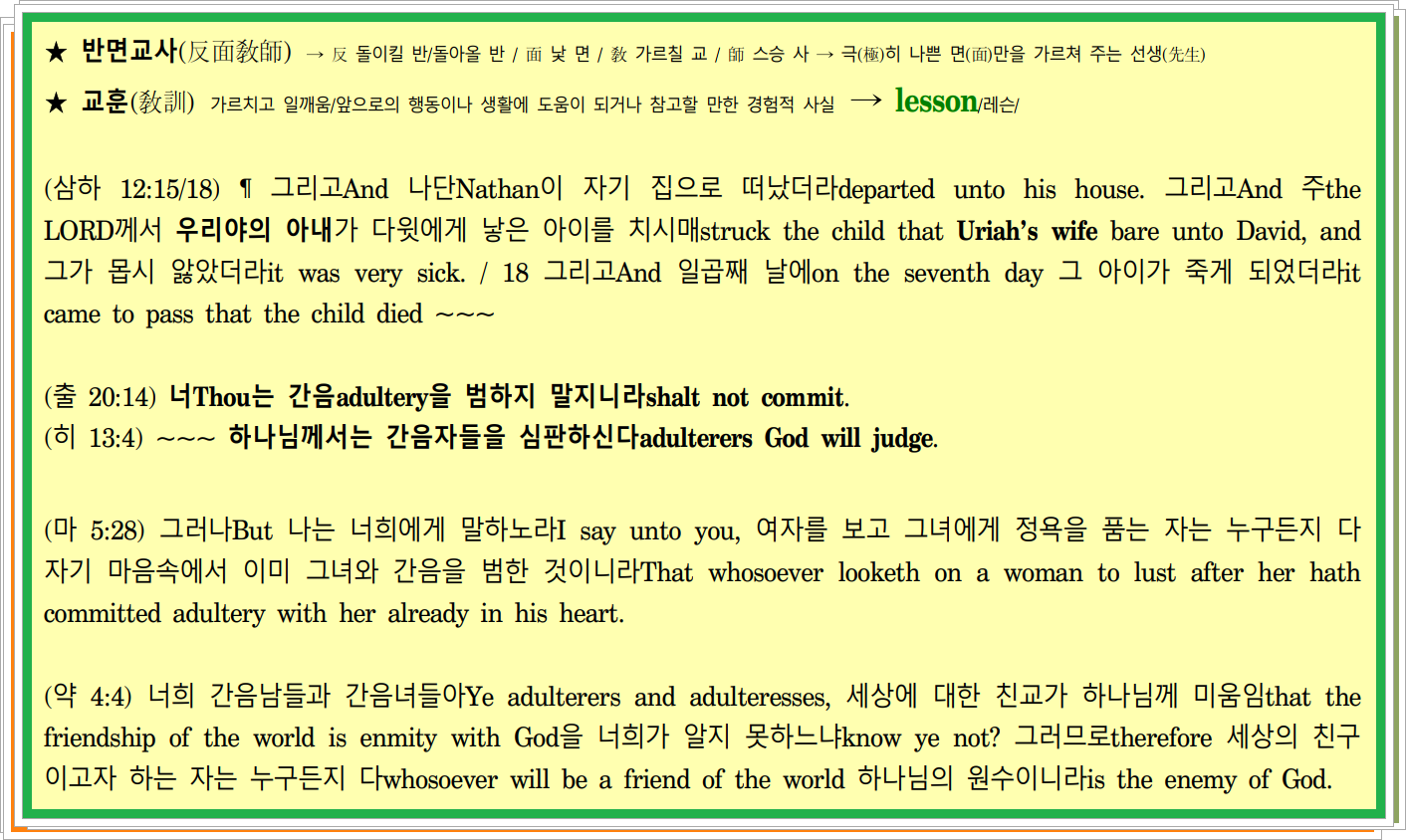 (왕상 11:1-4/6/9) 그러나But 솔로몬 왕king Solomon이 파라오의 딸을 포함해together with the daughter of Pharaoh 많은 이방 여인들을 사랑하였으니loved many strange women 모압 족속, 암몬 족속, 에돔 족속, 시돈 족속 그리고 헷 족속의 여인들women of the Moabites, Ammonites, Edomites, Zidonians, and Hittites이었더라. / 2 그 민족들에 관하여 주께서 이스라엘 자녀들에게 말씀하셨더라Of the nations concerning which the LORD said unto the children of Israe, “너희는 그들에게 들어가지 말지니라Ye shall not go in to them 또한 그들도 너희에게로 들어오지 말지니라neither shall they come in unto you. 이는for 그들they이 자기들의 신들을 따르도록after their gods 너희의 마음을 돌이킬것이will turn away your heart 분명하기surely 때문이니라 ~~~.” / 3 ~~~ 그의 아내들his wives이 그의 마음을 돌이켰더라turned away his heart. / 4 이는For 솔로몬이 늙었을 때에when Solomon was old 그의 아내들이 다른 신들을 따르도록 그의 마음을 돌이키게 되었기it came to pass that his wives turned away his heart after other gods 때문이었더라 ~~~ / 6 그리고And 솔로몬Solomon이 주의 눈앞에서in the sight of the LORD 악을 행하며did evil, and 자기 아버지 다윗과는 달리as did David his father 완전하게 주를 따라 가지 아니하였더라went not fully after the LORD. / 9 ¶ 그리고And 그의 마음이 주 이스라엘의 하나님으로부터 돌아섰기 때문에because his heart was turned from the LORD God of Israel 주께서 솔로몬에게 분노하셨더라the LORD was angry with Solomon ~~~
