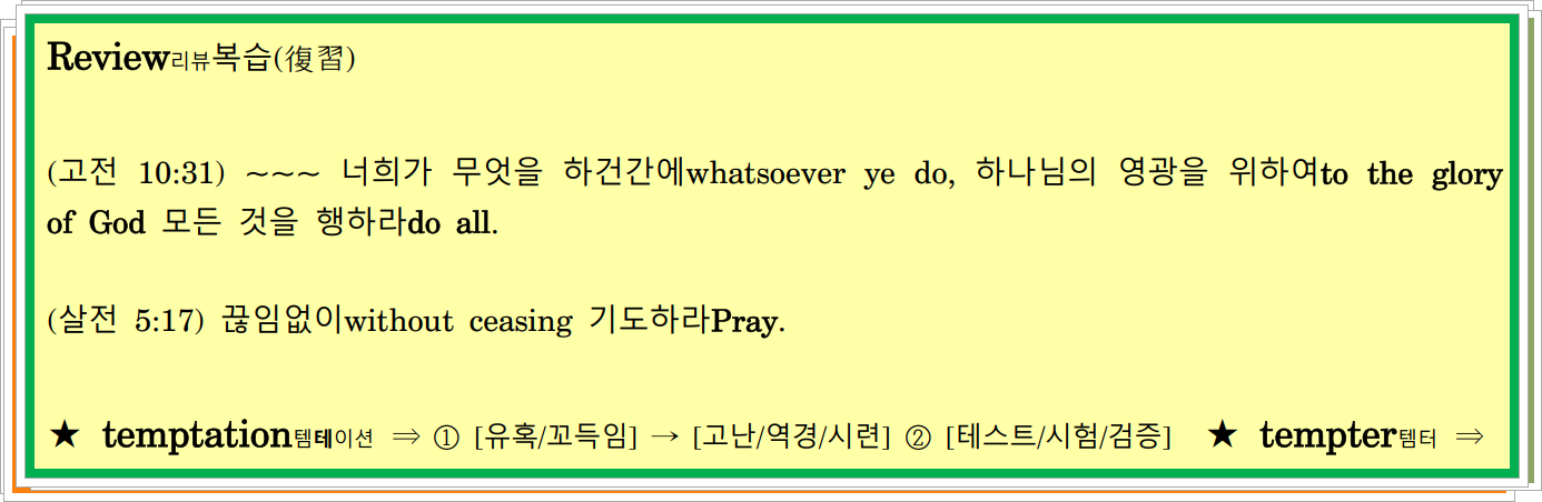 (고전 10:13) 사람에게 공통인 그러한 것외에 어떤 시련도 너희를 취하지 못했느니라There hath no temptation taken you but such as is common to man 오히려but 하나님은 신실하셔서God is faithful who분은 너희가 감당할 수 있는 것 이상으로above that ye are able 너희가 시련 당하는 것을 허락치 아니하시느니라will not suffer you to be tempted 오히려but 너희가 그것을 감당할 수 있도록that ye may be able to bear it 시련과 함께with the temptation 피할 길도 만들어 주시느니라will also make a way to escape