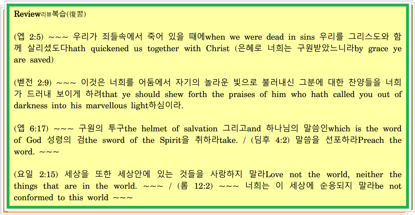 (고전 15:52/53) ~~~ 눈 깜짝할 사이에in the twinkling of an eye 순식간에In a moment ~~~ 우리가 변화되리라we shall be changed. / 53 이는 이 썩을 것corruptible이 반드시 썩지 아니함을 입고must put on incorruption 이 죽을 것mortal이 반드시 죽지 아니함을 입어야하기must put on immortality때문이로다.