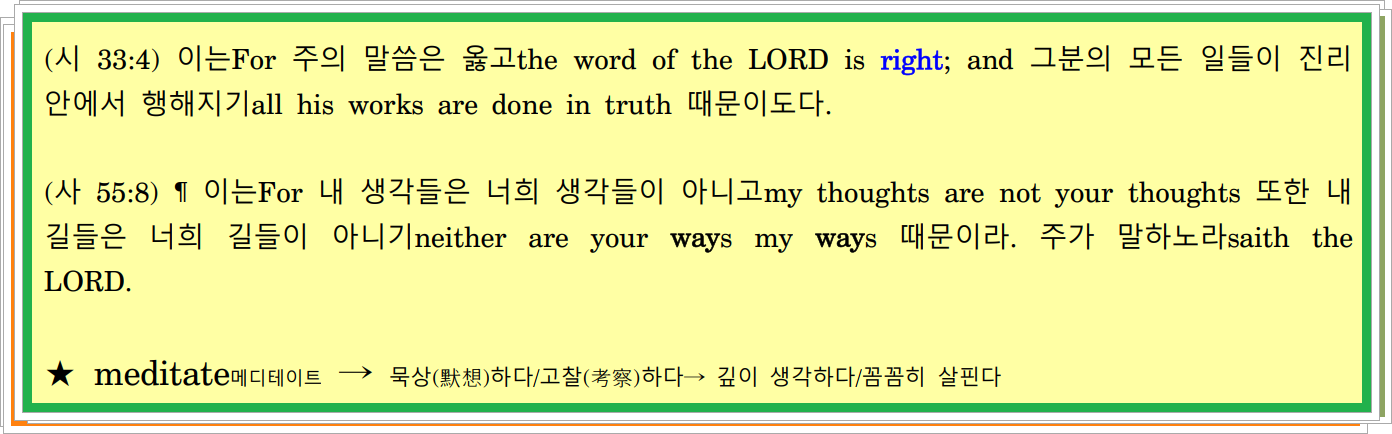 (수 1:8) 이 율법의 책This book of the law이 네 입에서 떠나지 말지니라shall not depart out of thy mouth; 오히려but 너thou는 그안에서therein 밤낮으로day and night 묵상할지니라shalt meditate 이것은 네가 그안에 기록된 모든 것에 따라 지켜 행하기 위함이라that thou mayest observe to do according to all that is written therein 그리하면then 네가 네 길을 형통케 할 것이고thou shalt make thy way prosperous, and 그리하면then 네가 크게 성공할 것이기thou shalt have good success 때문이라for.