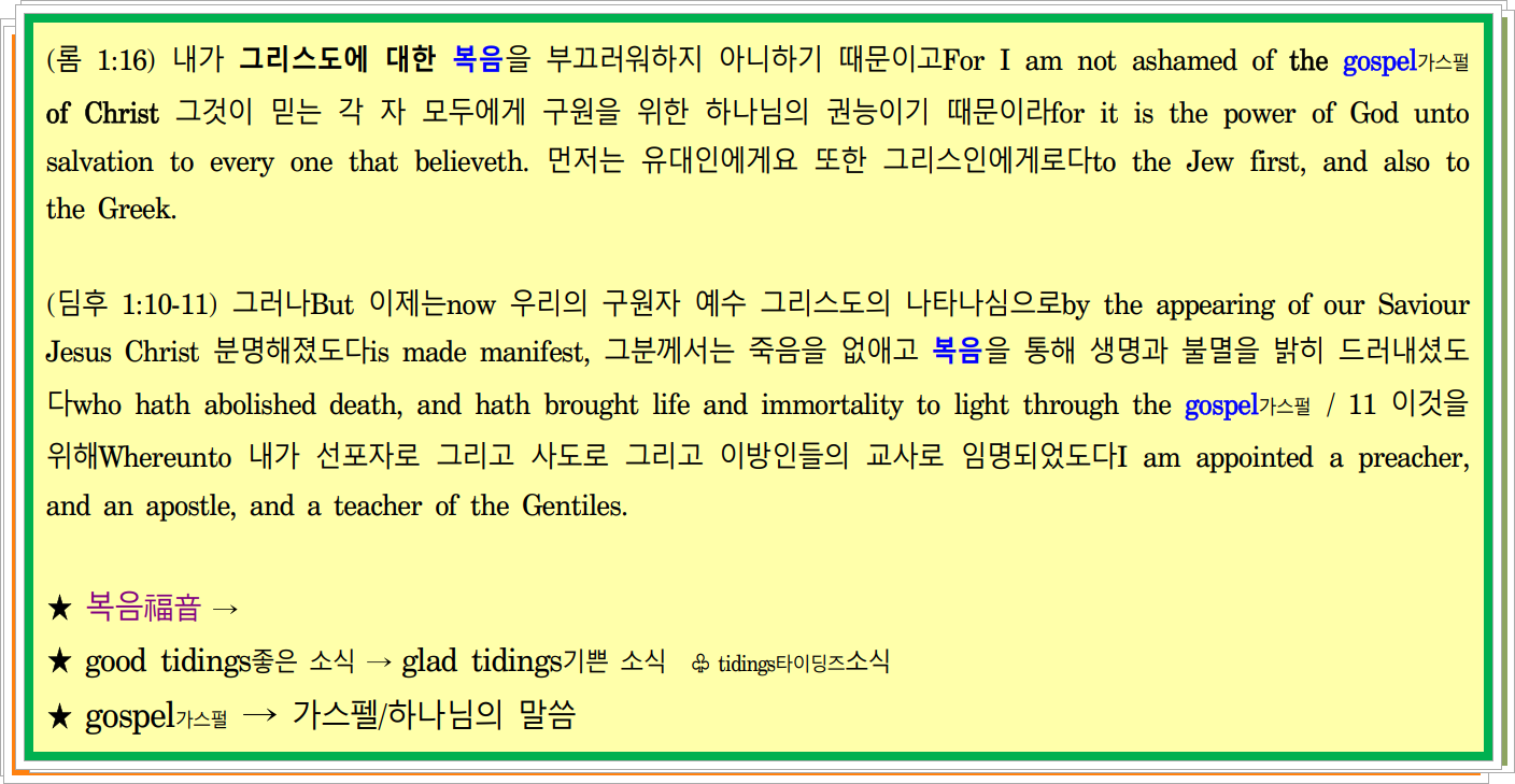 (고전 15:1-4) ~~~ 내가 너희에게 선포한 가스펠/복음the gospel which I preached unto you ~~~ / 2 ~~~ 너희가 헛되이 믿지 아니하였으면unless ye have believed in vain ~~~ 너희 또한 그것으로 구원받았느니라By which also ye are saved. / 3 ~~~ 기록들에 따라according to the scriptures 그리스도께서 우리의 죄들로 인하여 어떻게 죽으셨는지how that Christ died for our sins / 4 그리고And 그분이 묻히셨다는 것that he was buried 그리고and 기록들에 따라 셋째 날에 그분이 다시 일어나셨다는 것that he rose again the third day according to the scriptures이라
